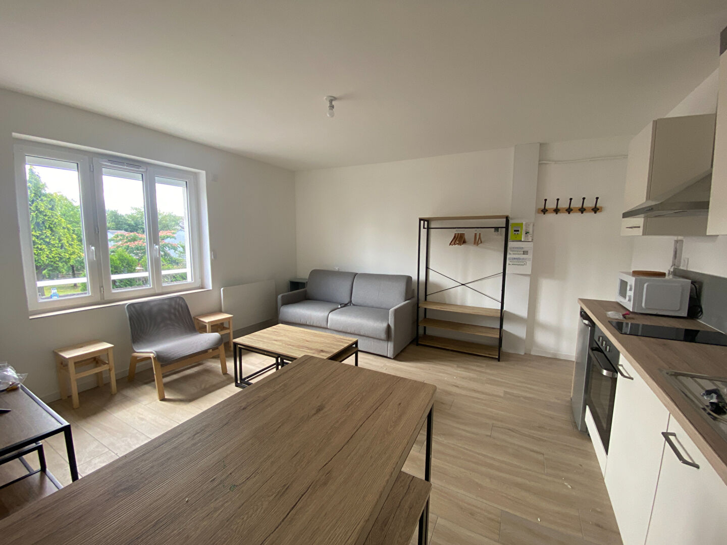 MURS ERIGNE - T1 Meublé situé au 1er étage d'une petite copropriété, rénové à neuf comprenant: un séjour avec une cuisine aménagée et équipée (plaque de cuisson, hotte, réfrigérateur top, four, lave linge), une salle d'eau avec WC, Une place de parking et une cave.