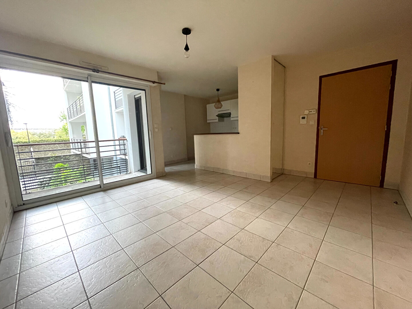 Un séjour spacieux et lumineux, ouvrant sur un balcon avec vue dégagée sur une cour arborée et soigneusement entretenue.