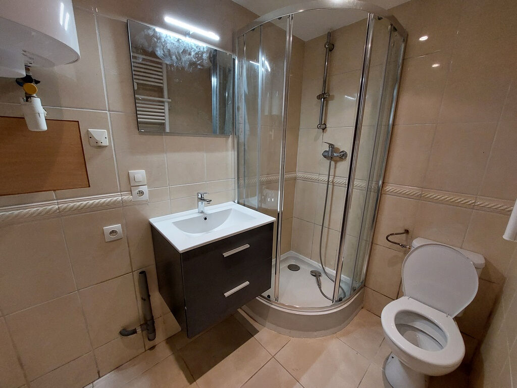 L'appartement se compose d'une pièce de vie avec sa cuisine équipée (hotte, plaque de cuisson, réfrigérateur) et d'une salle d'eau avec WC.