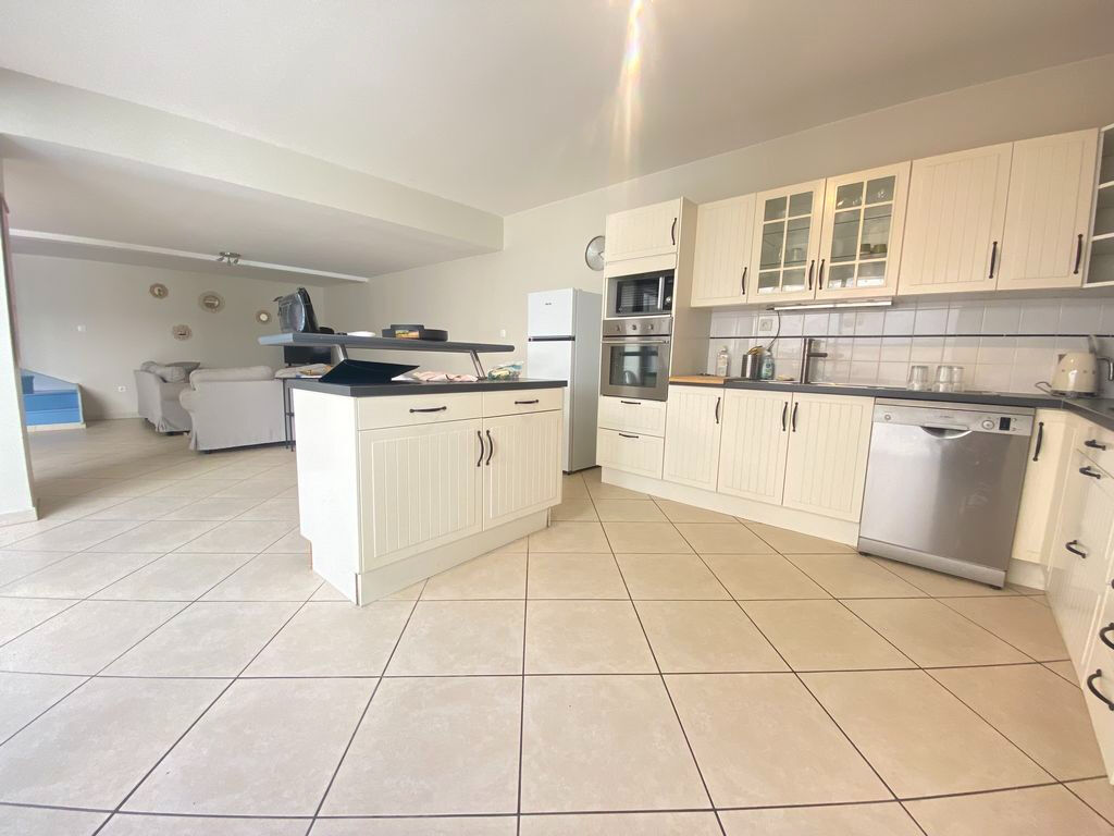 Cuisine moderne aménagée et équipée (réfrigérateur, four, micro-ondes, plaque de cuisson, hotte, lave-vaisselle). Pièce de vie lumineuse comprenant un coin repas et un salon avec double canapé, ouvrant sur une terrasse de 27.25m² exposée sud-est/nord-est.