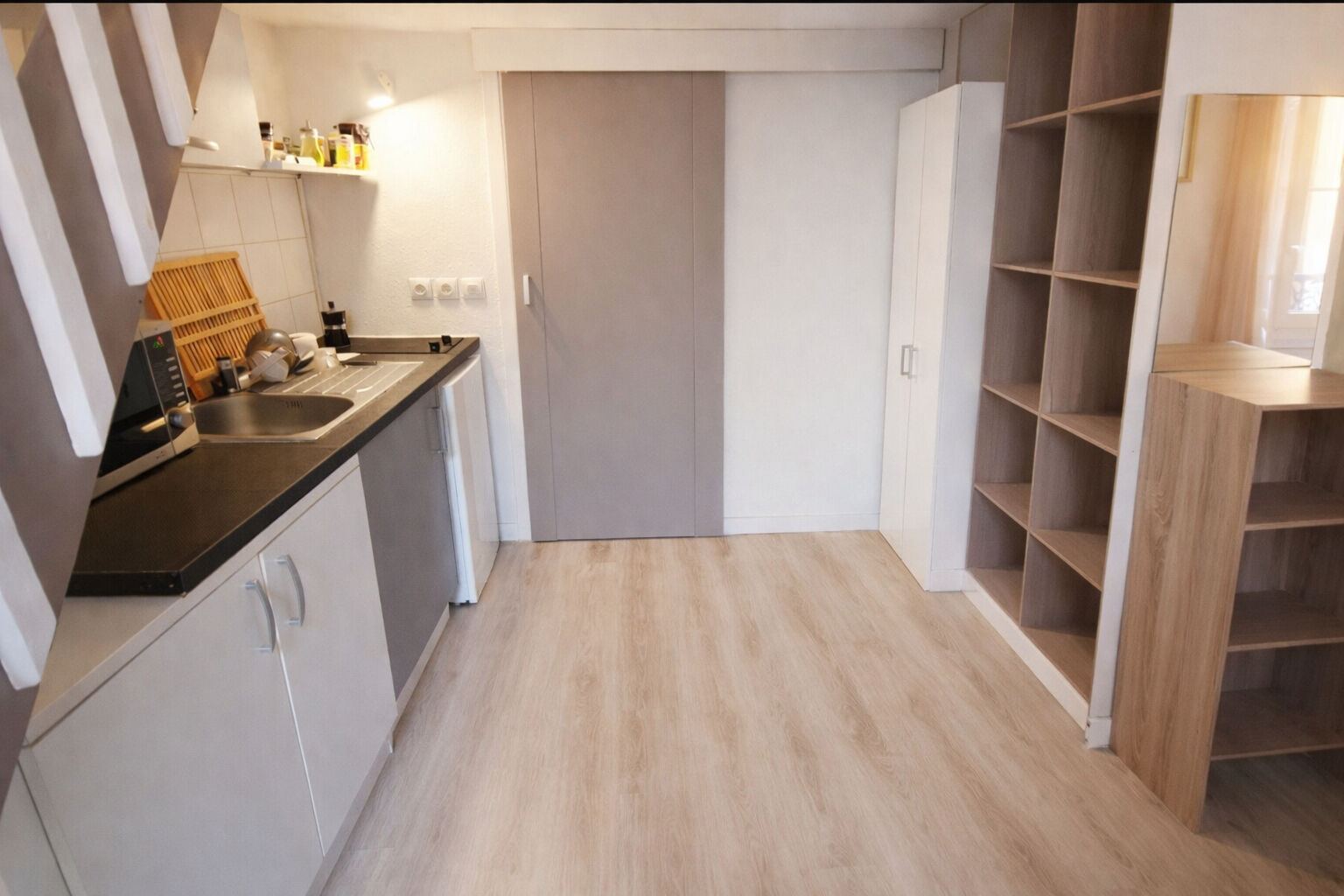 A proximité immédiate de l'avenue Jean Medecin, coquet studio meublé de 21m² + mezzanine composé d'une entrée avec petit placard, une pièce a vivre avec un espace détente et un espace cuisine, une salle de douche avec wc, et un couchage en mezzanine.