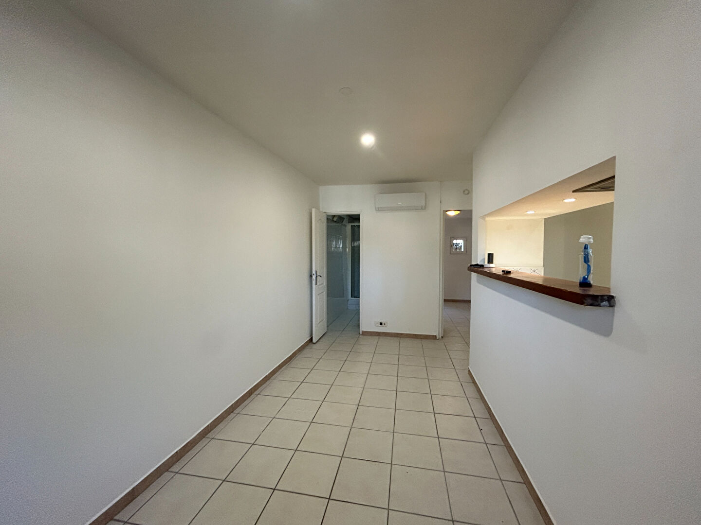 Un appartement en Rez-de-chaussée comprenant une entrée , un séjour climatisée avec cuisine ouverte aménagée et équipée , une salle d'eau / WC et une chambre avec placard.