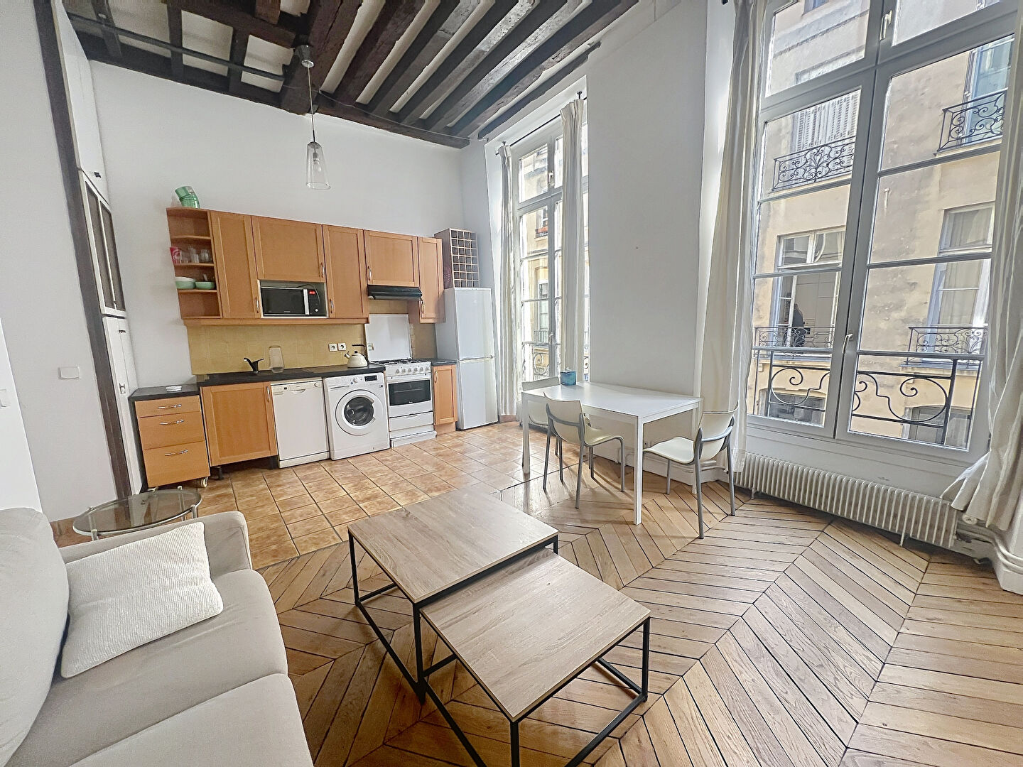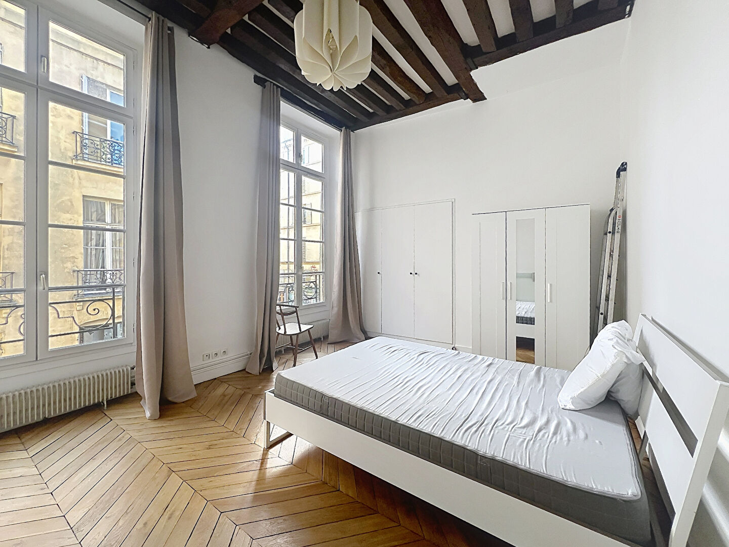 Au Coeur de la rue de Turenne, à 200m de la place des Vosges, dans un immeuble ancien, 2 pièces meublé de 42M² en parfait état, avec 3,65m de hauteur sous plafond, exposé Sud/Ouest comprenant: une cuisine ouverte équipée, un séjour, une chambre et une salle d'eau avec wc. local vélos dans l'immeuble.