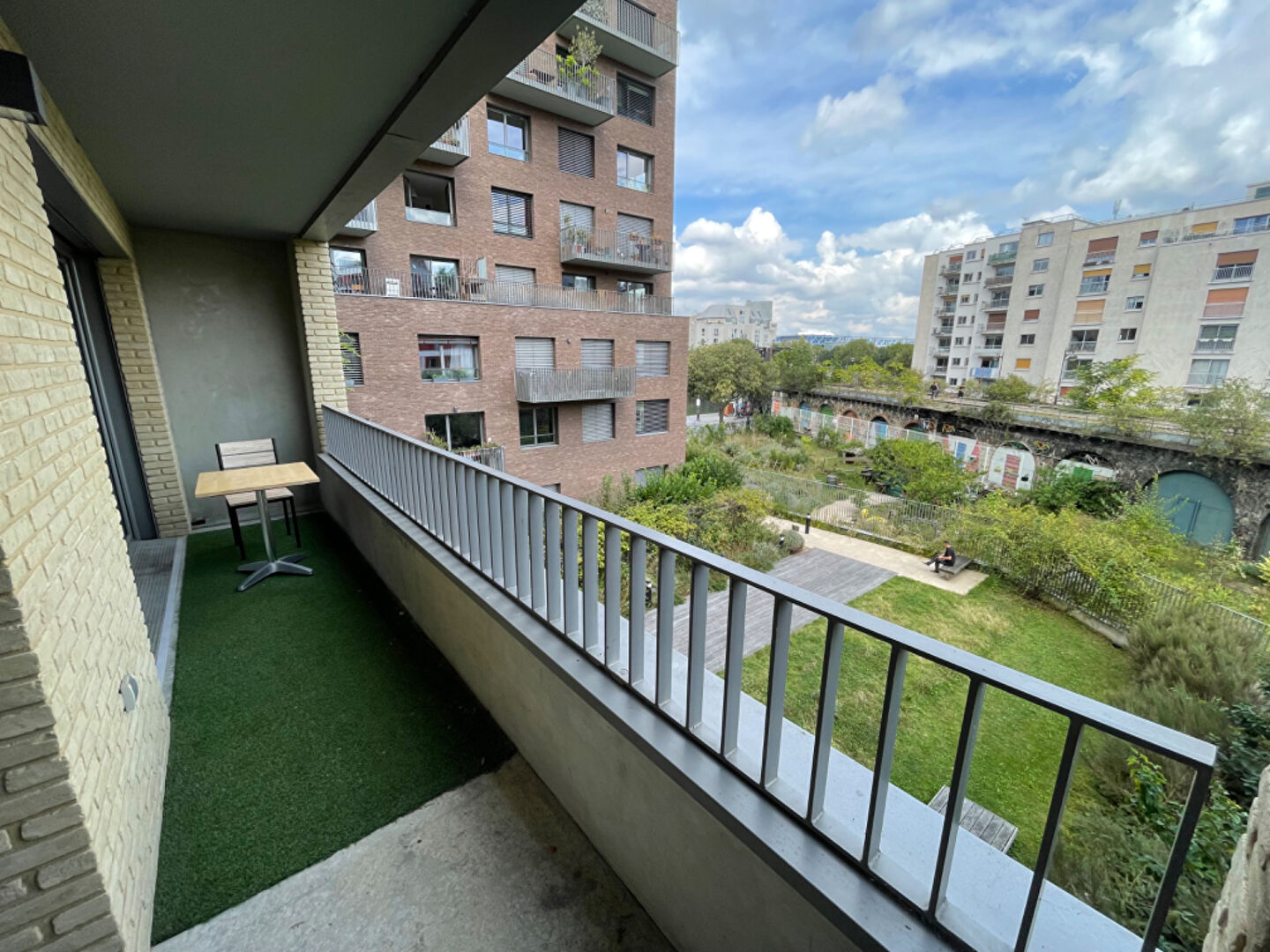 A louer, studio meublé avec balcon de 25m2 situé 21, rue de Thionville - Paris 19e dans une résidence construite en 2015 avec ascenseur comprenant une pièce de vie avec placard, un coin cuisine, une salle d'eau avec WC et un balcon.