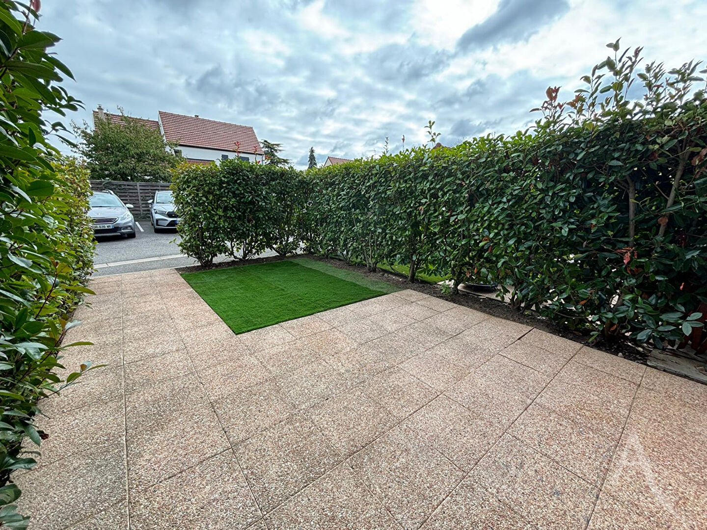 Un extérieur avec terrasse et pelouse synthétique complète le confort et le charme de cet appartement.