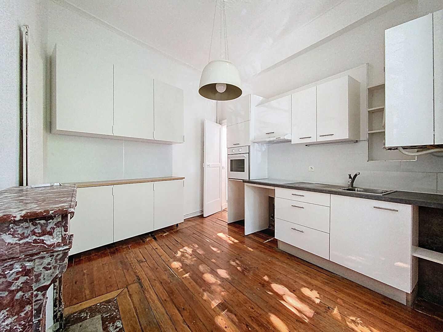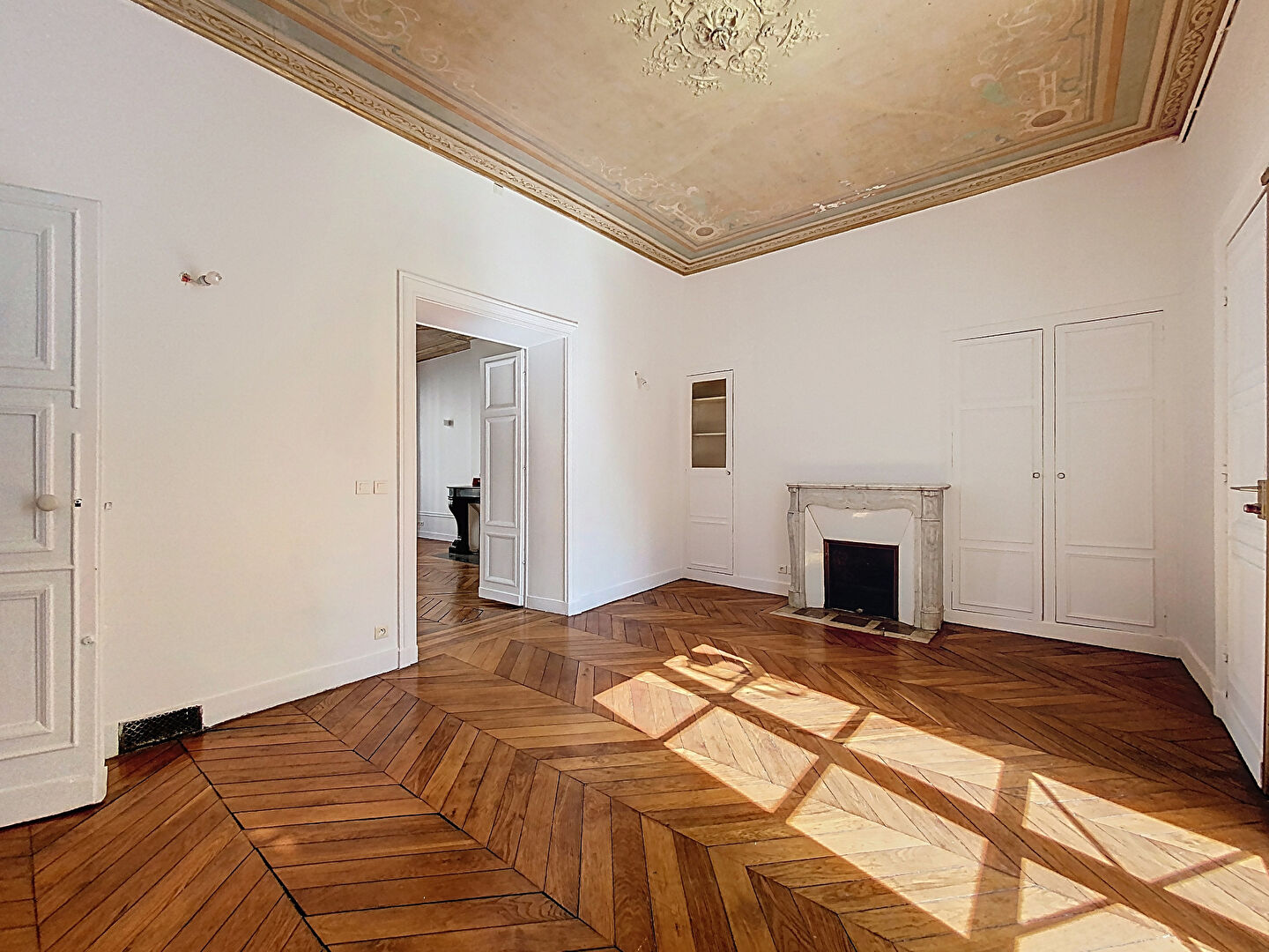 Au premier étage d'un bel immeuble calme et bien entretenu, l'appartement dispose d'une vaste entrée, de deux belles pièces de réception avec cheminée, moulures et parquet en point de Hongrie, d'une cuisine indépendante aménagée, ainsi que d'un wc séparé.