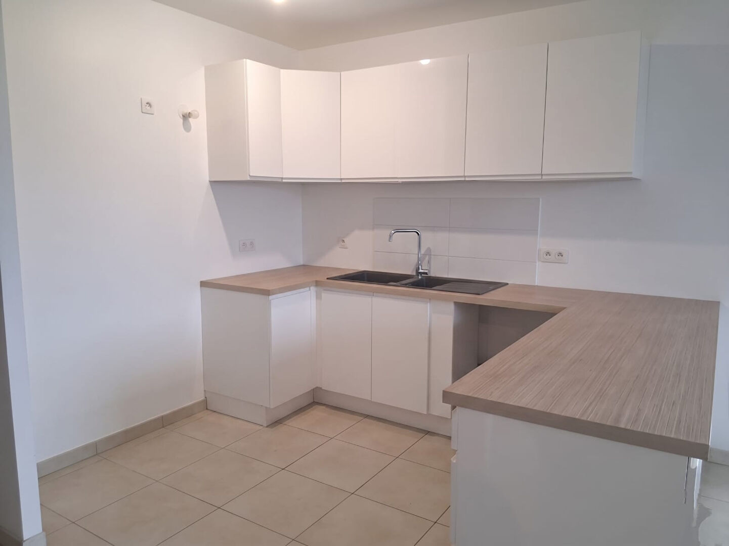 Cuisine moderne et équipée : Une belle cuisine aménagée (avec meubles hauts et meubles bas offrant de nombreux rangements), ouverte sur le salon et donnant un accès direct à la terrasse.