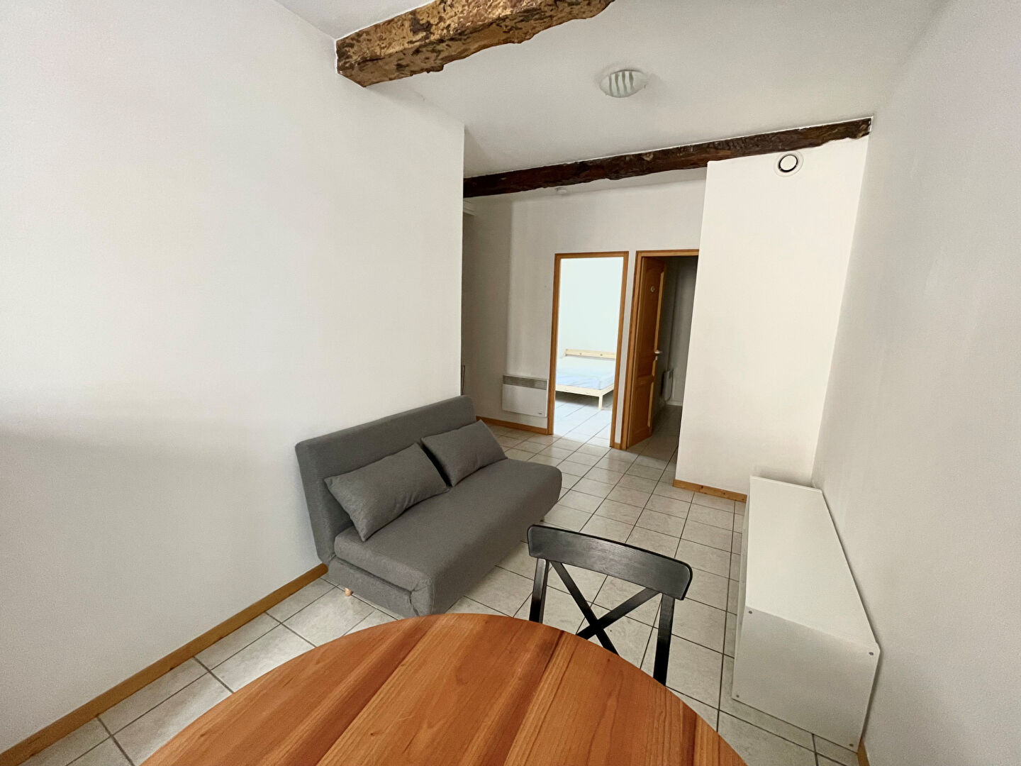 Cet appartement est composé d'une cuisine aménagée et équipée (hotte, plaques de cuisson, frigo, four micro-ondes) ouverte sur le séjour, d'une chambre séparée avec placards de rangement et d'une salle d'eau avec WC.