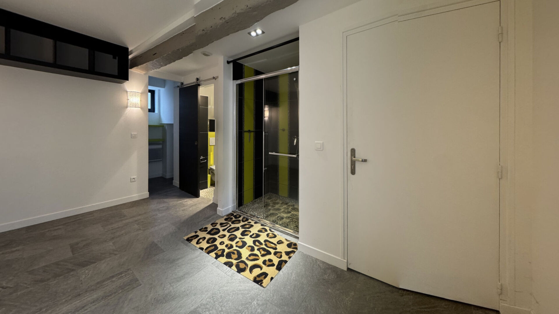 Une pièce de vie avec son coin cuisine, une douche, un WC séparé ainsi qu'un coin dressing et buanderie.