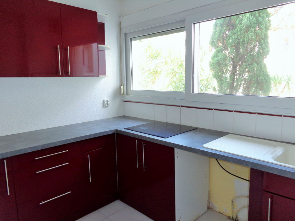 Sète- Bd Joliot Curie, Appartement de type 2 pièces situé au 1er étage avec ascenseur dans une résidence calme et arborée avec piscine, comprend : une entrée, un séjour avec placards ouvert sur une terrasse de 10 m², une chambre avec placards, une salle d'eau, un WC séparé, une cuisine indépendante.