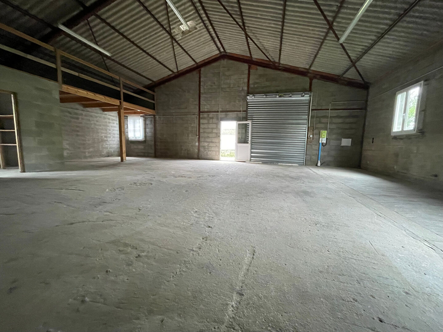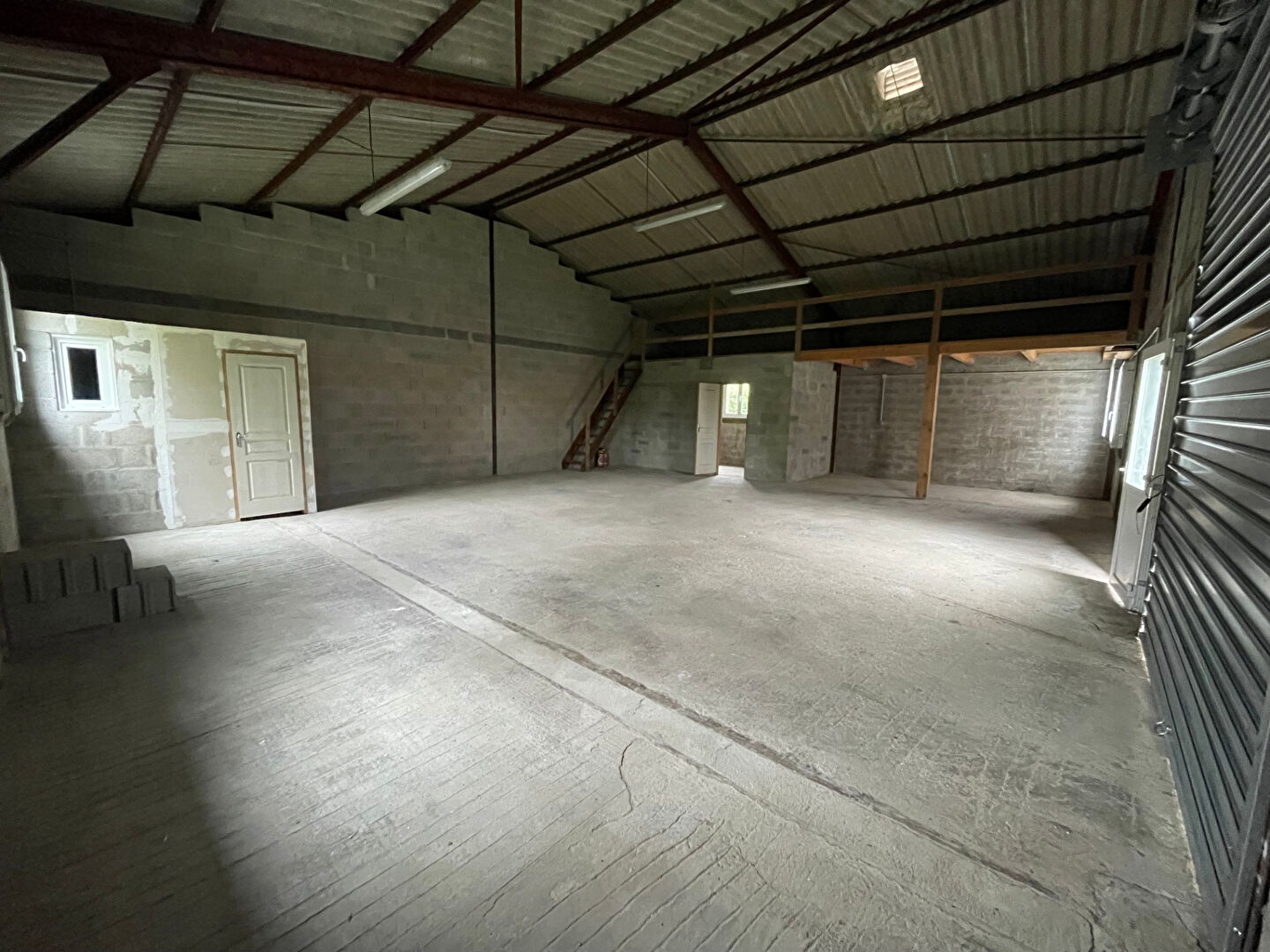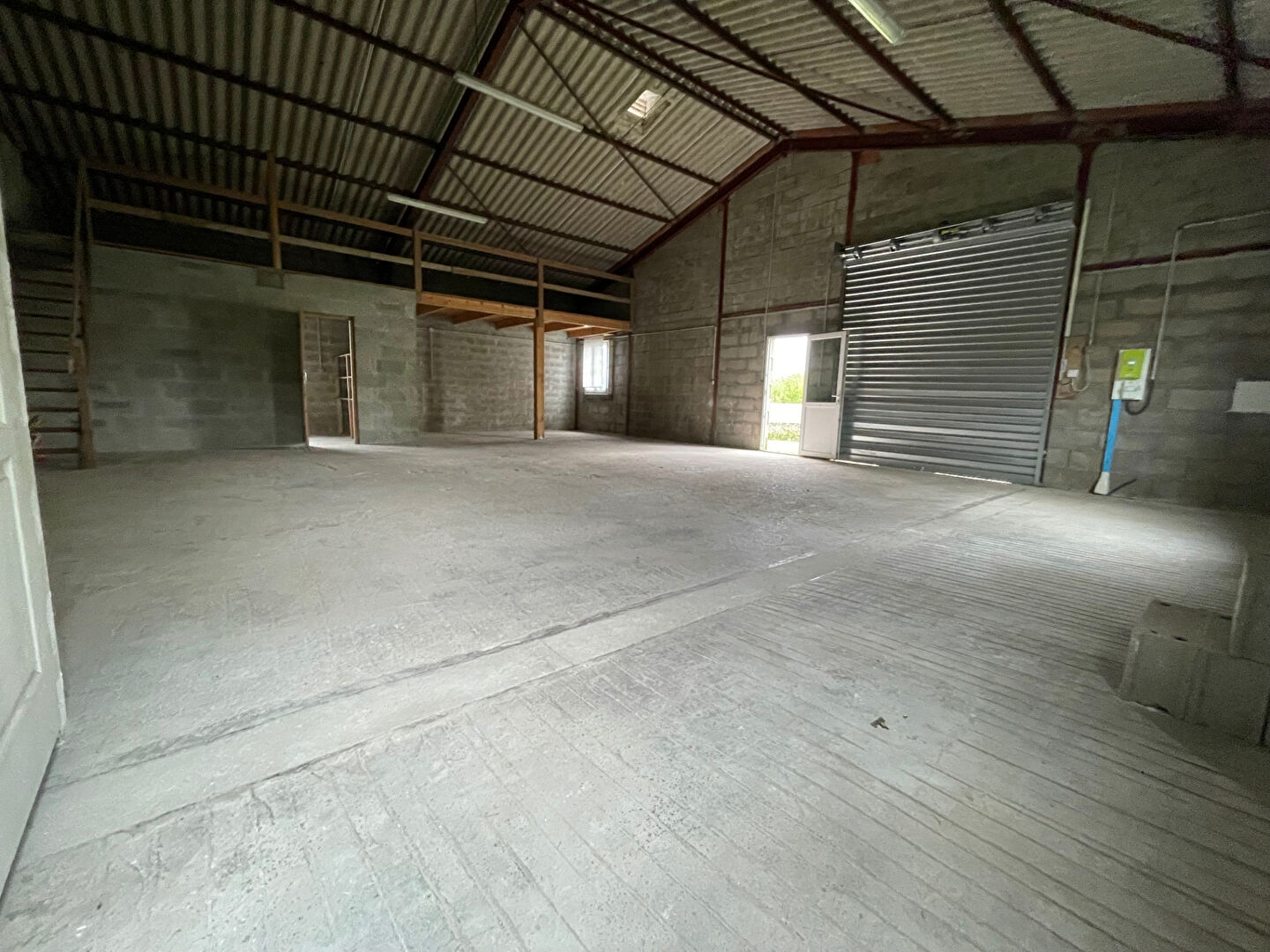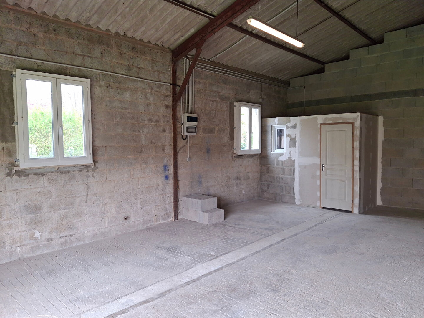 Le batiment est équipé de wc, eau, électricité, porte: hauteur 3,09m et largeur 2,77m.