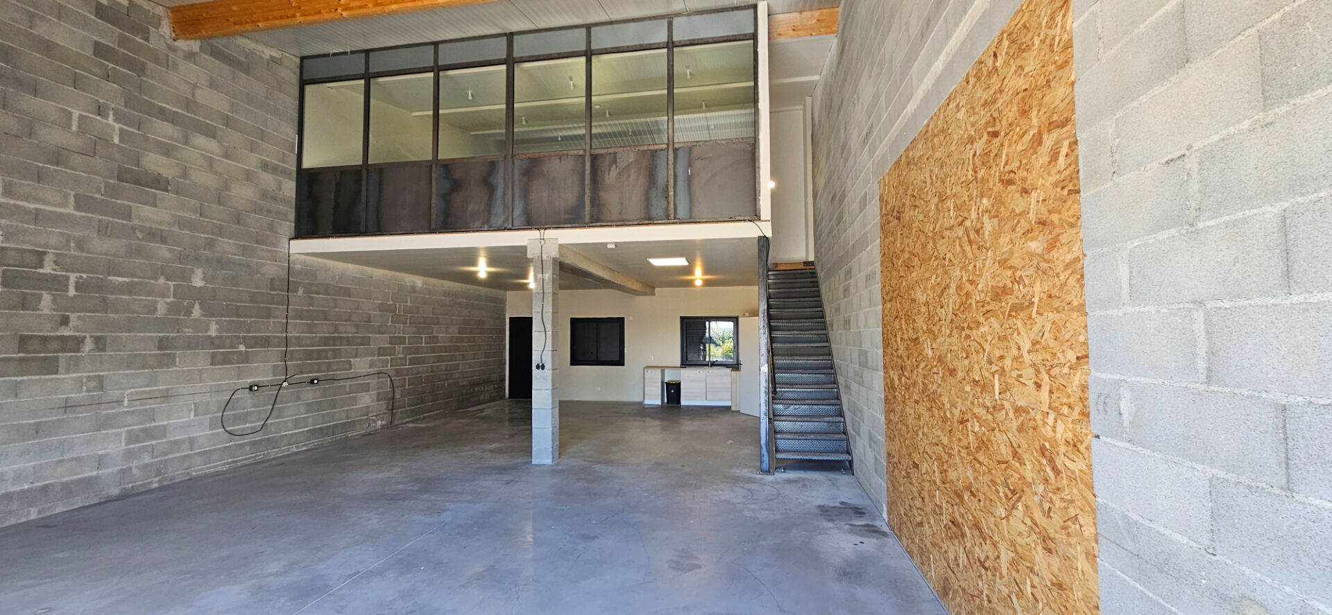 Garidech, zone d'activité proche autoroute A8, local de 106m2 à louer avec porte sectionnelle grande hauteur et porte pour le personnel. Hauteur sous plafond 6 mètres. Sanitaires et kitchenette. Bureaux en étage de 52m2 climatisés. Parking.