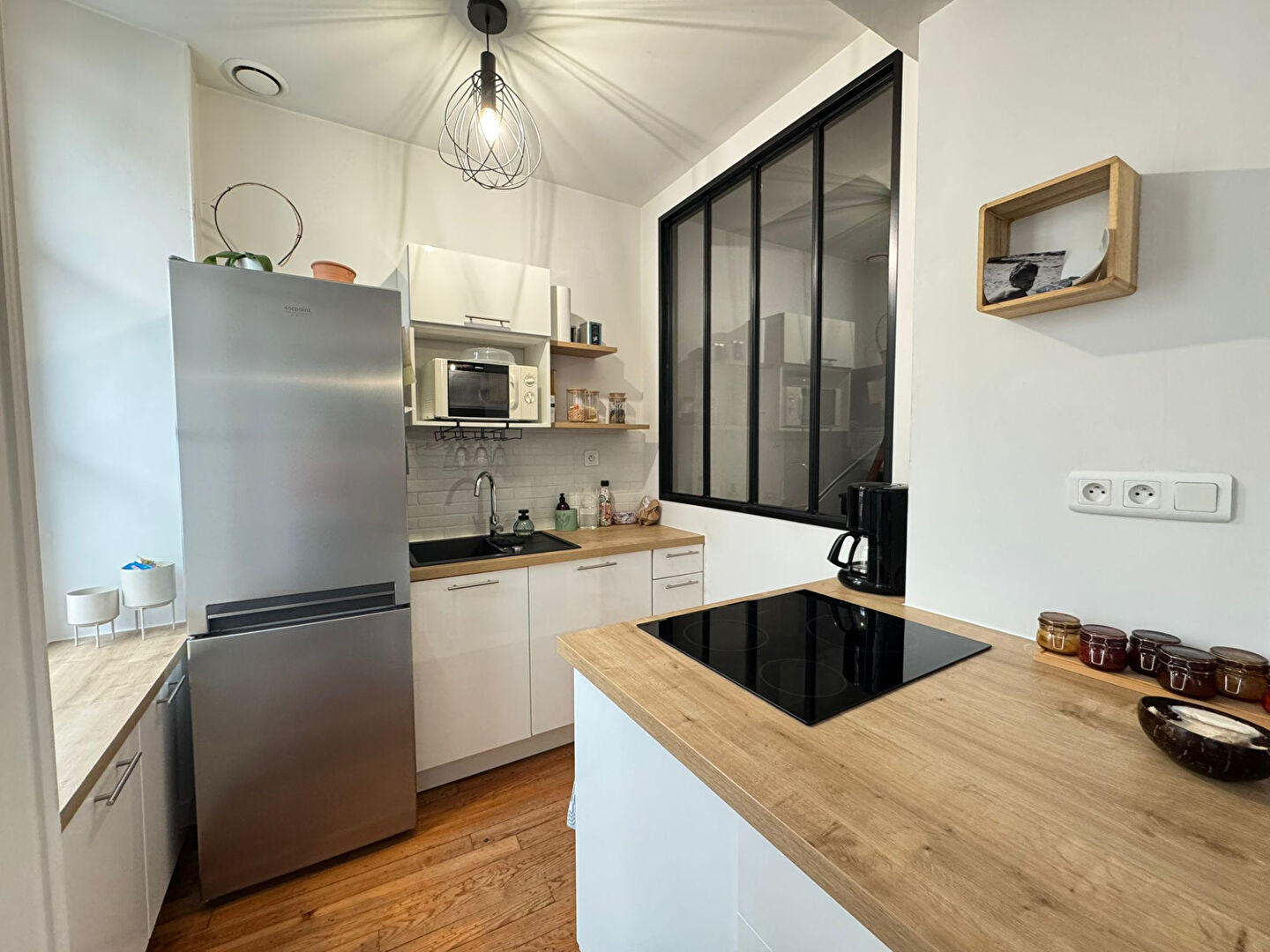 Au 1er étage : un salon séjour entièrement sur parquet avec cuisine ouverte aménagée et équipée (plaque vitrocéramique, four, lave-vaisselle et micro-onde)