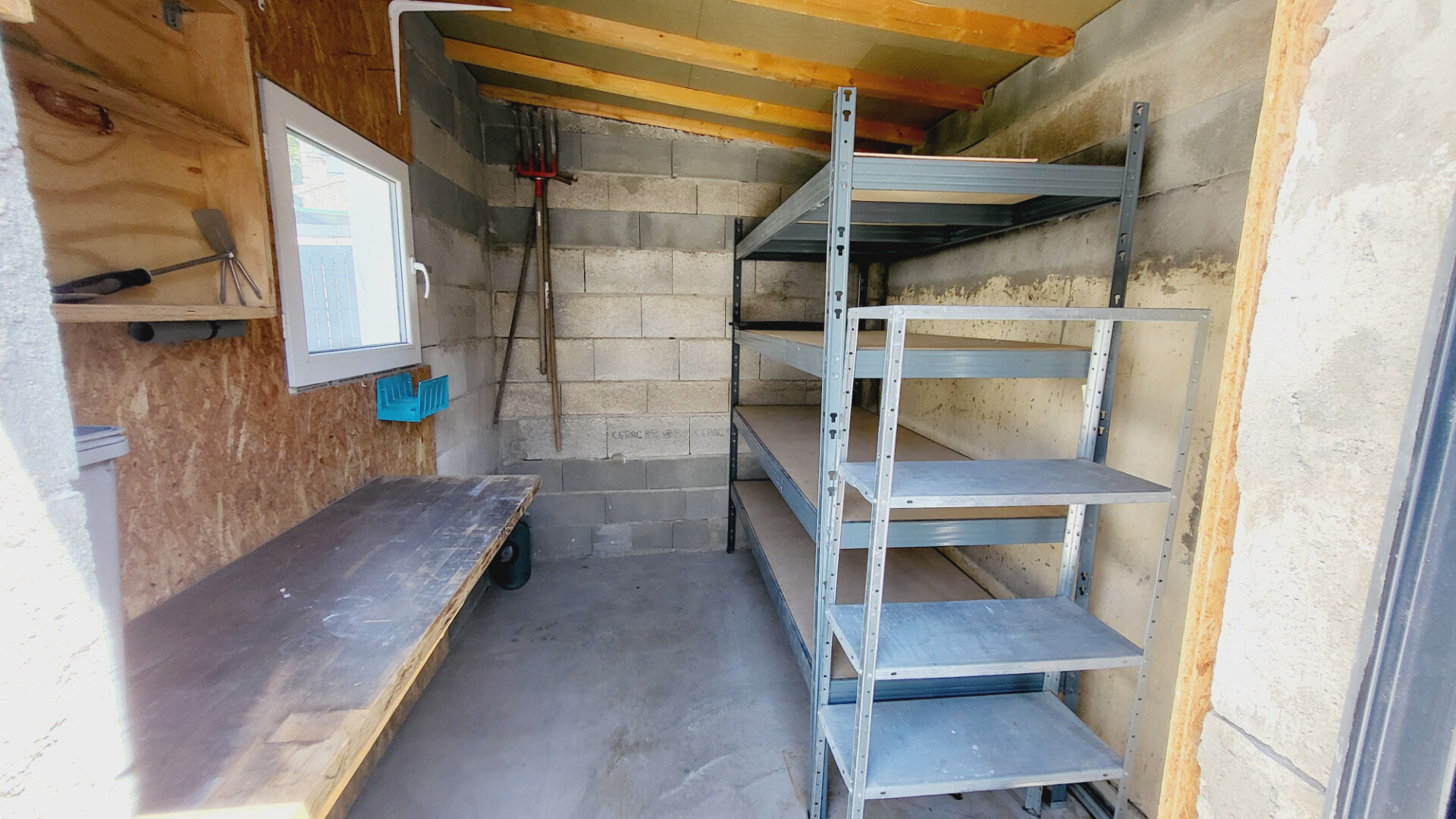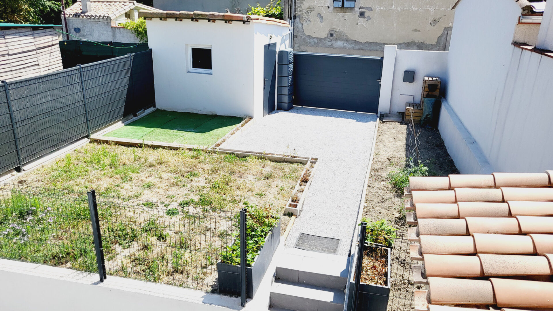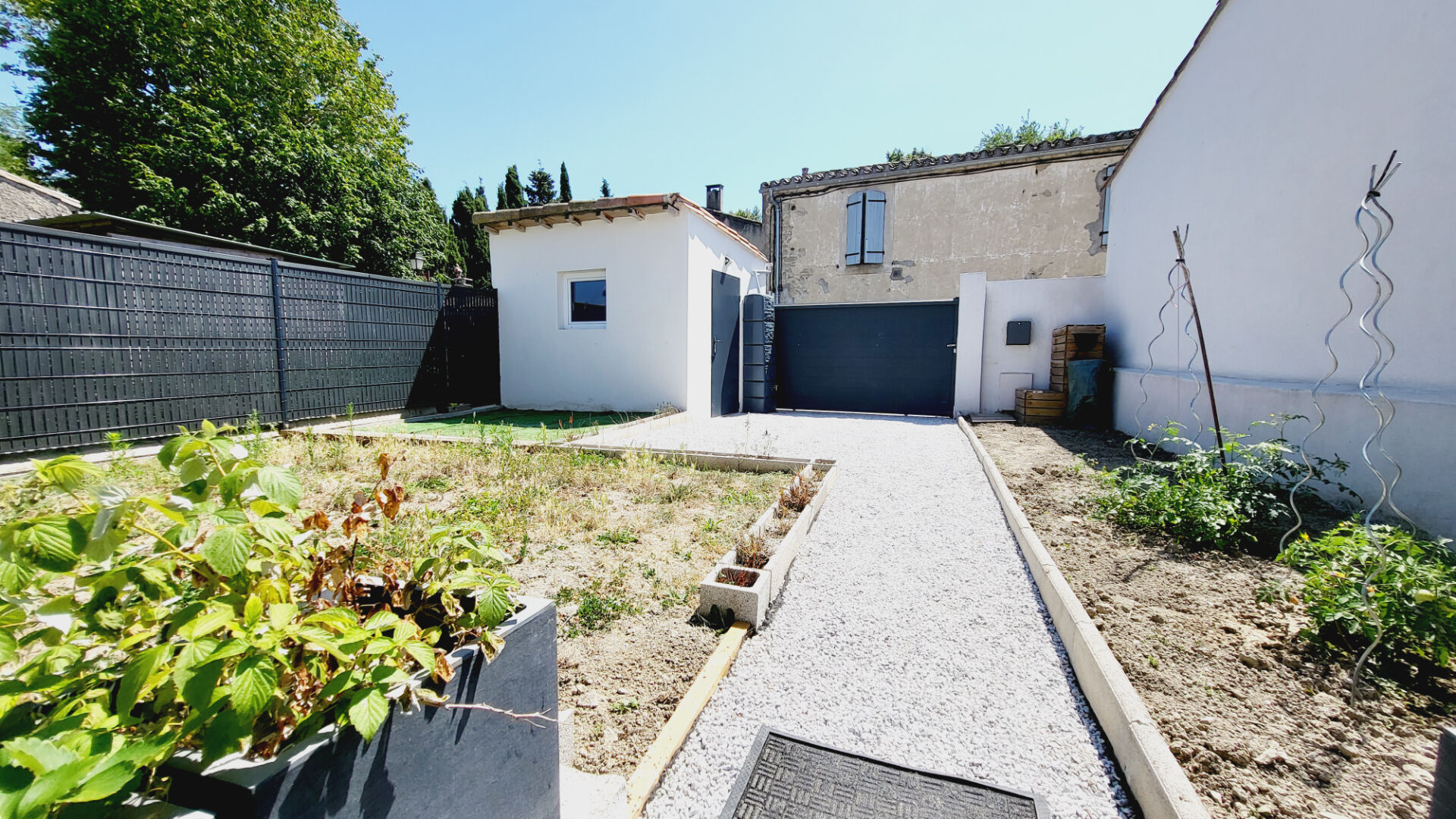 Un jardin clos avec un box fermé et un espace rangement extérieur vous amène vers la terrasse et vers l'intérieur de la maison.