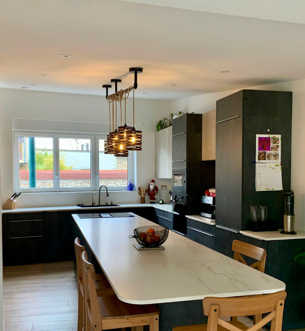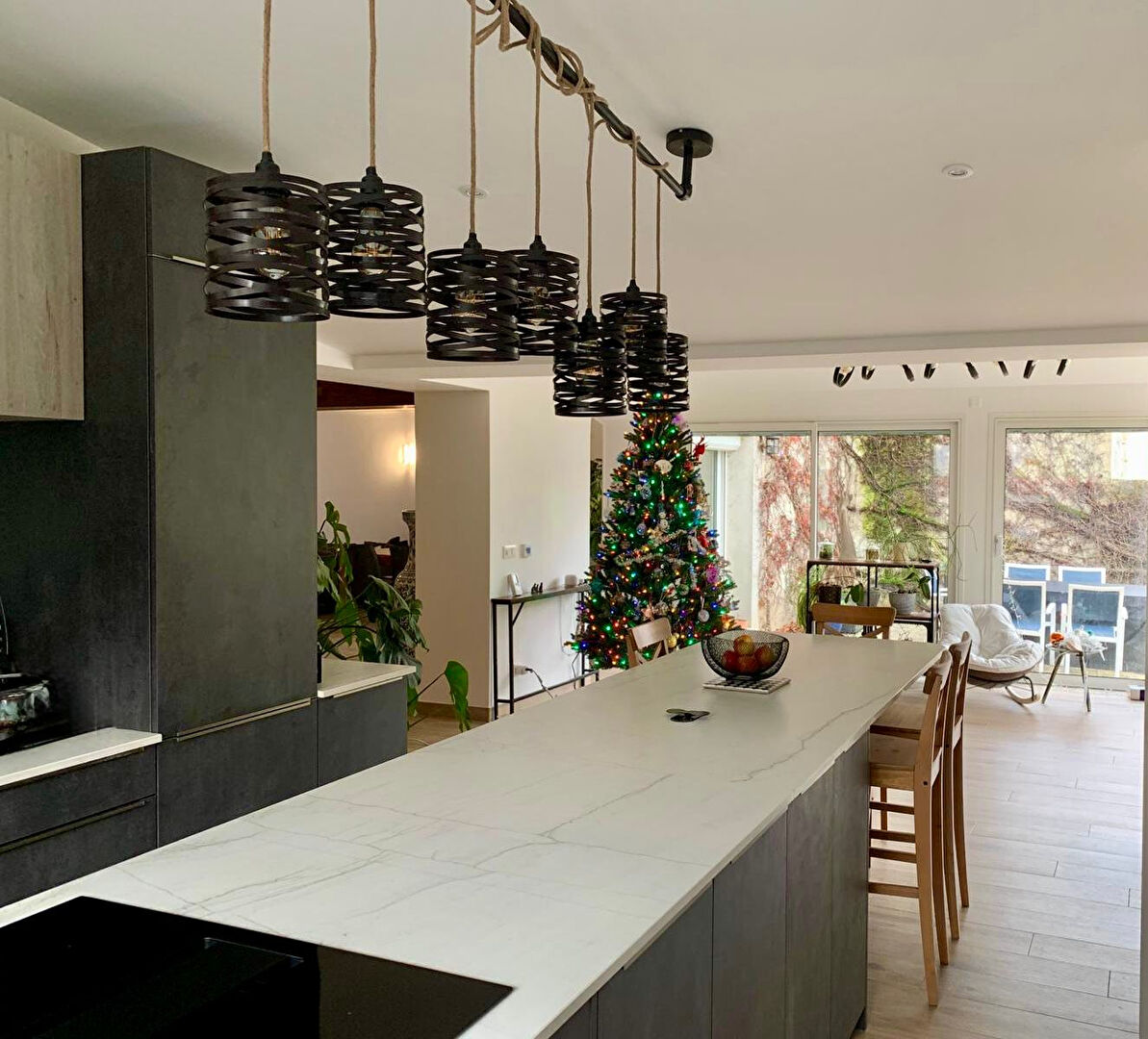 Une cuisine moderne, aménagée et entièrement équipée, ouverte sur l'espace de vie