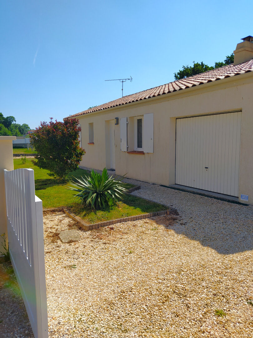 À Challans, agréable maison de plain-pied comprenant une belle pièce de vie lumineuse avec poêle à bois, une cuisine aménagée et équipée, un dégagement desservant trois chambres, une salle de bains et des WC séparés.
