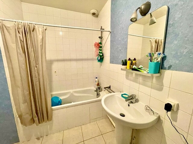 Cuisine ouverte sur séjour, 2 chambres avec placards, une salle de bains, wc