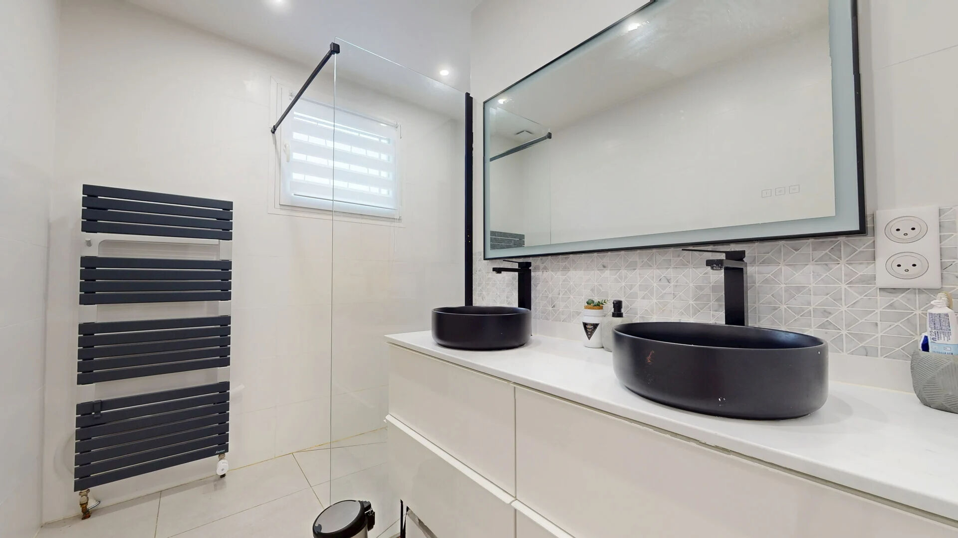 Il est composé d'une salle de bain avec douche a l'italienne, deux chambres avec rangements intégrés, une pièce de vie entièrement ouverte avec séjour, salle à manger et cuisine ouverte toute équipée qui donne sur une véranda.