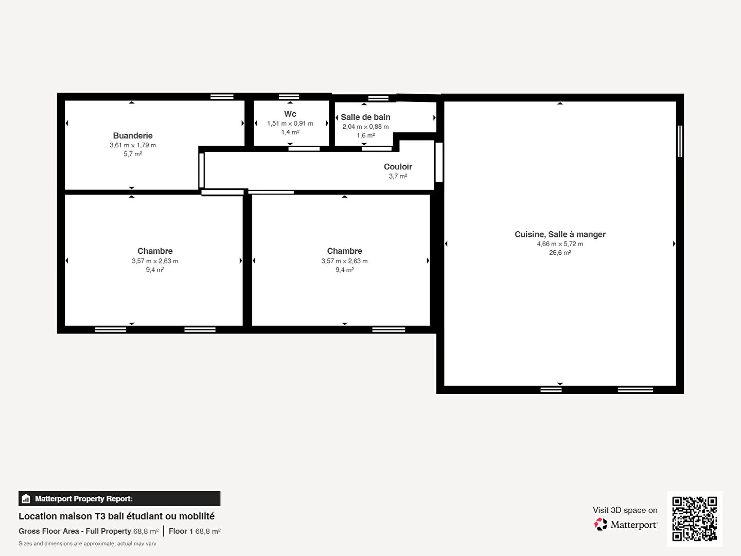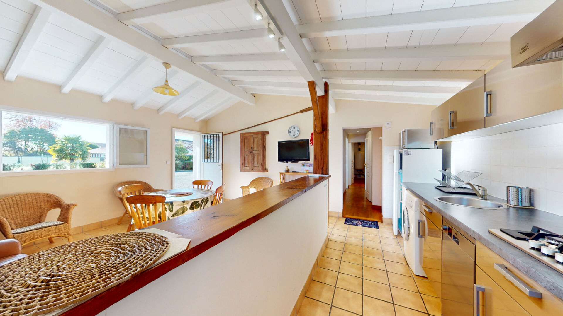 L'entrée s'ouvre sur une pièce de vie lumineuse avec cuisine ouverte entièrement équipée. Un couloir dessert deux chambres, une salle d'eau, des WC séparés ainsi qu'un espace buanderie / bureau, idéal pour le télétravail ou le rangement.