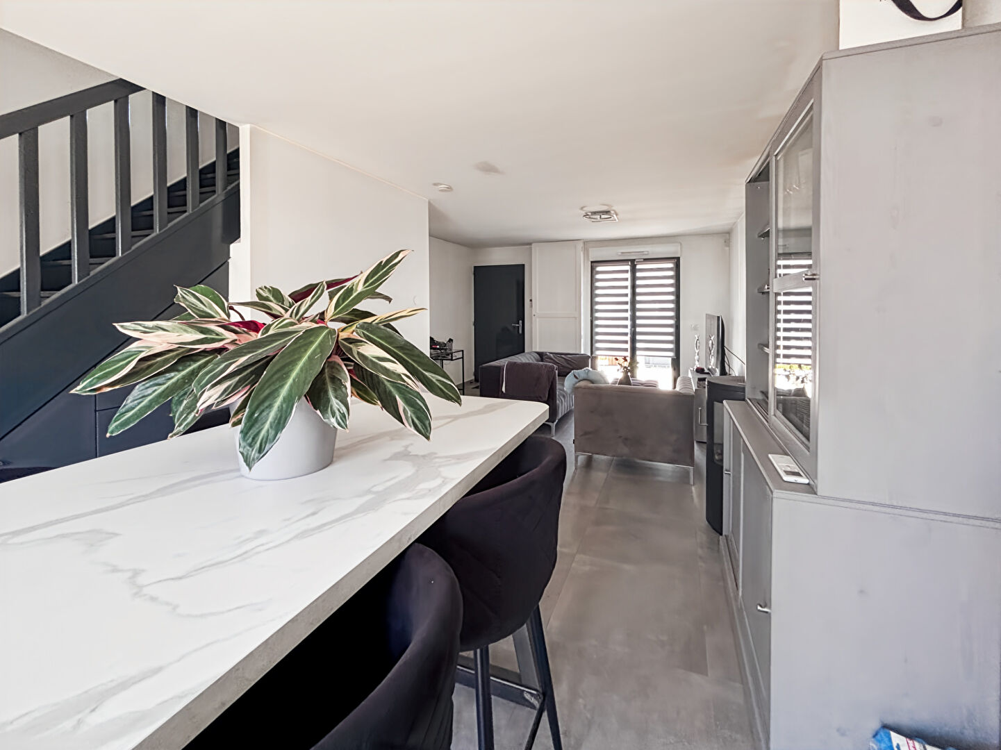 Au rez-de-chaussée: une entrée sur le séjour avec rangement (sous l'escalier), une cuisine ouverte, aménagée et équipée (hotte aspirante et plaque de cuisson) avec placard pouvant servir de buanderie, une première chambre avec salle d'eau et WC indépendant.
