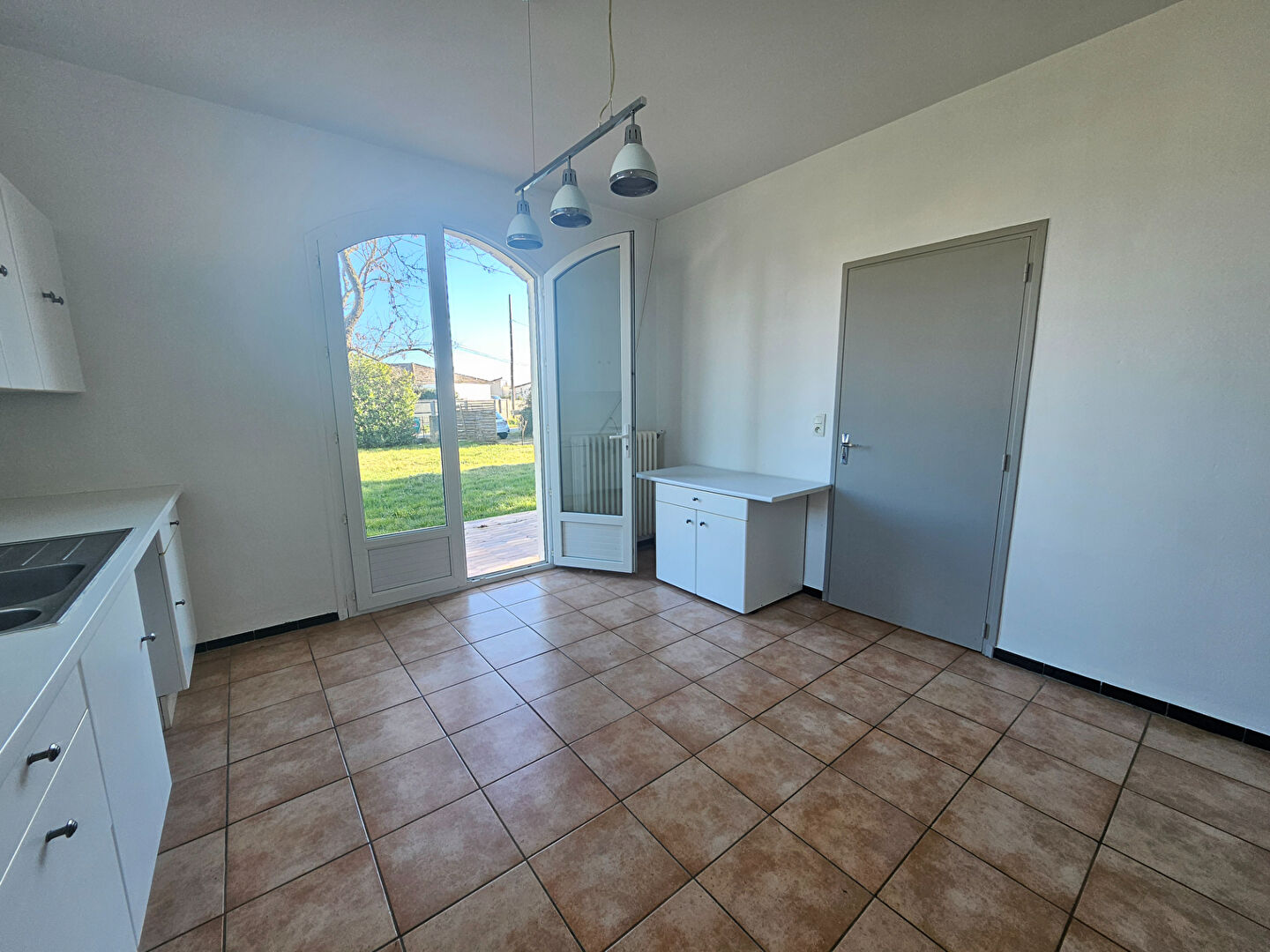 Elle comprend, une vaste entrée desservant la pièce de vie lumineuse avec un accès sur la terrasse et la cuisine aménagée et équipée (hotte, plaque, meubles hauts et bas) avec un accès à la buanderie.