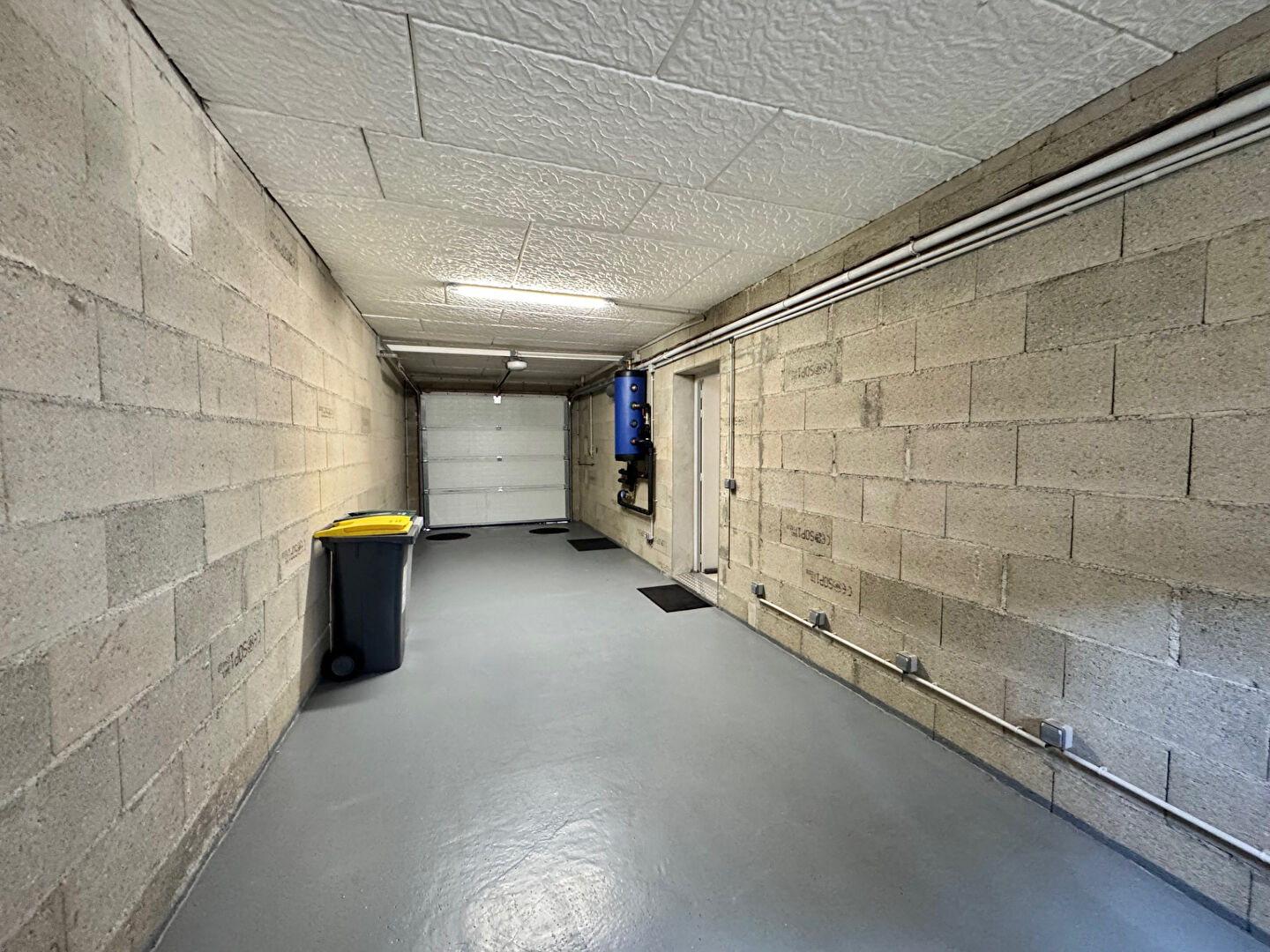 Au rez-de-chaussée: Un garage double avec porte motorisée, une entrée avec placards de rangement, une grande pièce pouvant servir de bureau, chambre ou salle de jeu donnant sur une cour murée et sans vis à vis.
