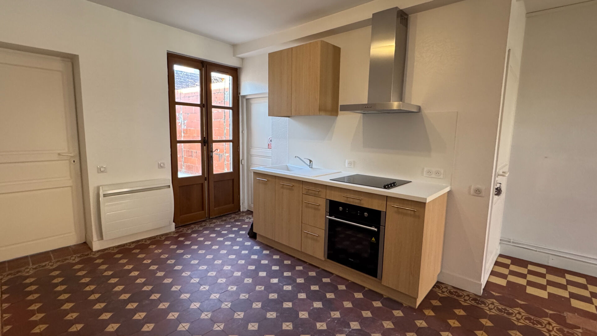 Espace de vie au rez-de-chaussée comprenant une pièce avec espace cuisine aménagée et équipée neuve, arrière cuisine, wc, et courette sur l'arrière sans vis à vis, idéale pour vos repas l'été.