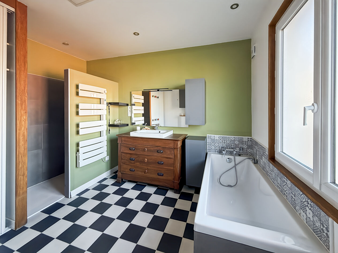 Au premier étage , un palier desservant deux chambres en enfilade, une salle de bains avec baignoire, douche et WC.