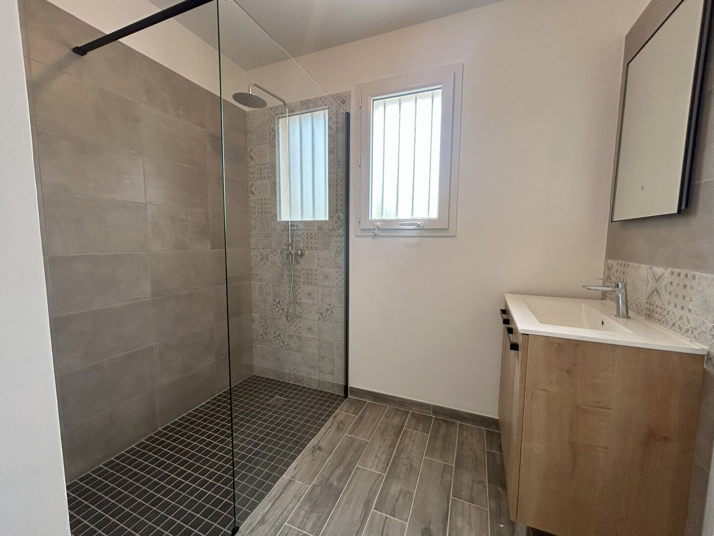 Pièce de vie avec cuisine aménagée et équipée (plaque, hotte,) 3 chambres, une salle d'eau avec douche à l'italienne et wc indépendants.