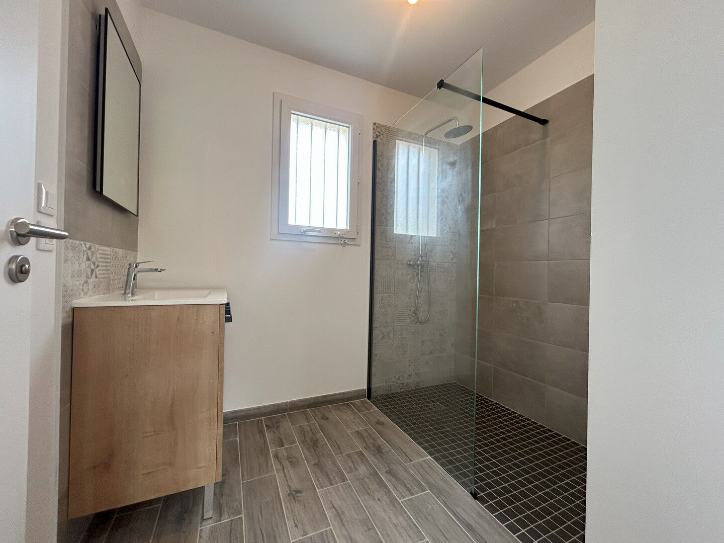 Séjour lumineux avec cuisine aménagée et équipée (plaque, hotte,) 3 chambres, une salle d'eau avec douche à l'italienne et wc indépendants.
