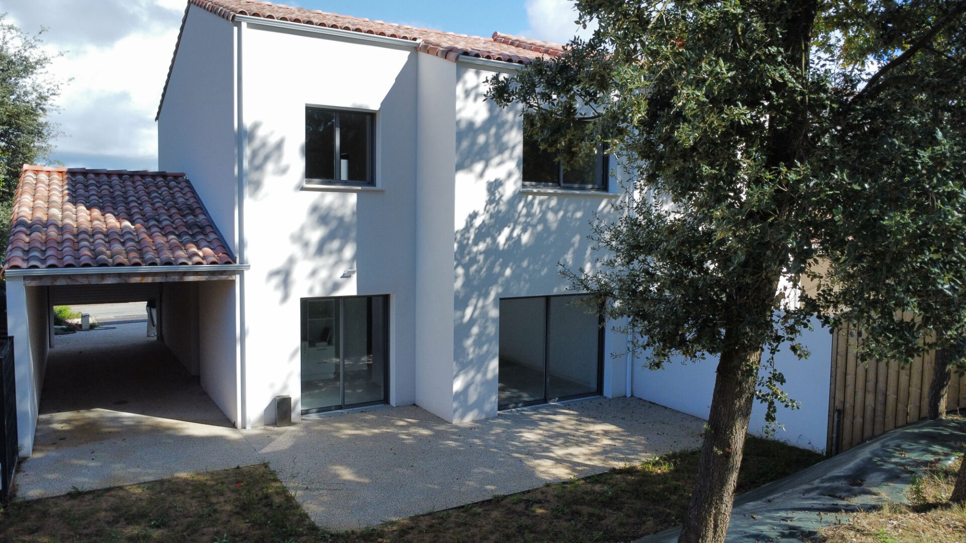 SAINT VINCENT SUR JARD, maison neuve, comprenant au rez-de-chaussée : une entrée, un séjour, une cuisine aménagée, une buanderie, une chambre, une salle d'eau, un WC séparé - A l'étage : un palier, trois chambres avec placard, une salle d'eau, un WC séparé - Un préau - Une terrasse - Un local vélos - Libre - Contacter le 02.51.90.35.92