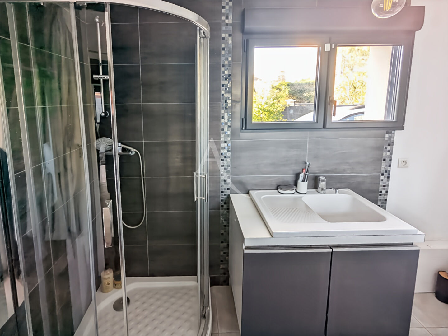 Étage : vaste séjour lumineux ouvert sur une cuisine aménagée et équipée, avec accès à un balcon, dégagement, WC indépendant, deux chambres, et une salle d'eau moderne avec douche à l'italienne.