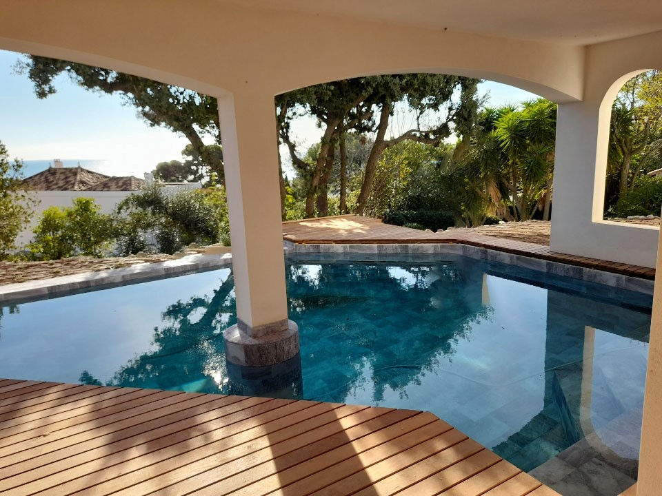 Bâtie sur un terrain de 1250 m² arboré avec piscine, elle offre au rez-de-chaussée, un hall, un bureau, un vaste séjour avec cuisine aménagée et en partie équipée donnant sur deux terrasses dont une exposée Sud-Est offrant une agréable vue sur la mer, une chambre avec baignoire et lavabo, 2 chambres dont une avec grand dressing, une salle de bains, un WC indépendant.
