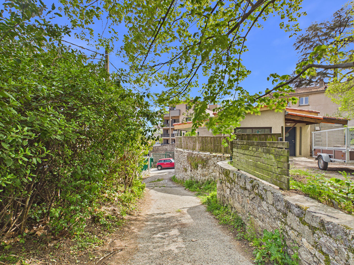 À l'extérieur, la maison dispose de terrasses situées de chaque côté, permettant de profiter de différents espaces de détente tout au long de la journée. Deux parcelles de jardin supplémentaires viennent agrémenter l'ensemble, une cave ainsi qu'un espace de stationnement pouvant accueillir plusieurs véhicules.