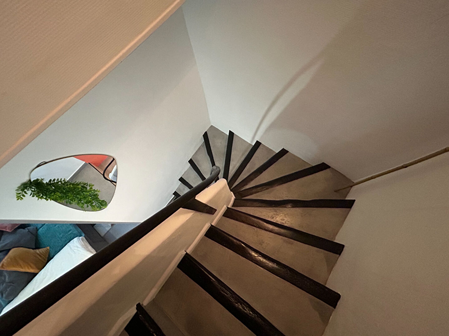 Au premier étage, vous découvrirez une belle pièce de vie lumineuse avec séjour et cuisine ouverte aménagée et équipée (réfrigérateur, four, hotte, plaque à induction). La climatisation réversible assure un confort optimal en toute saison.