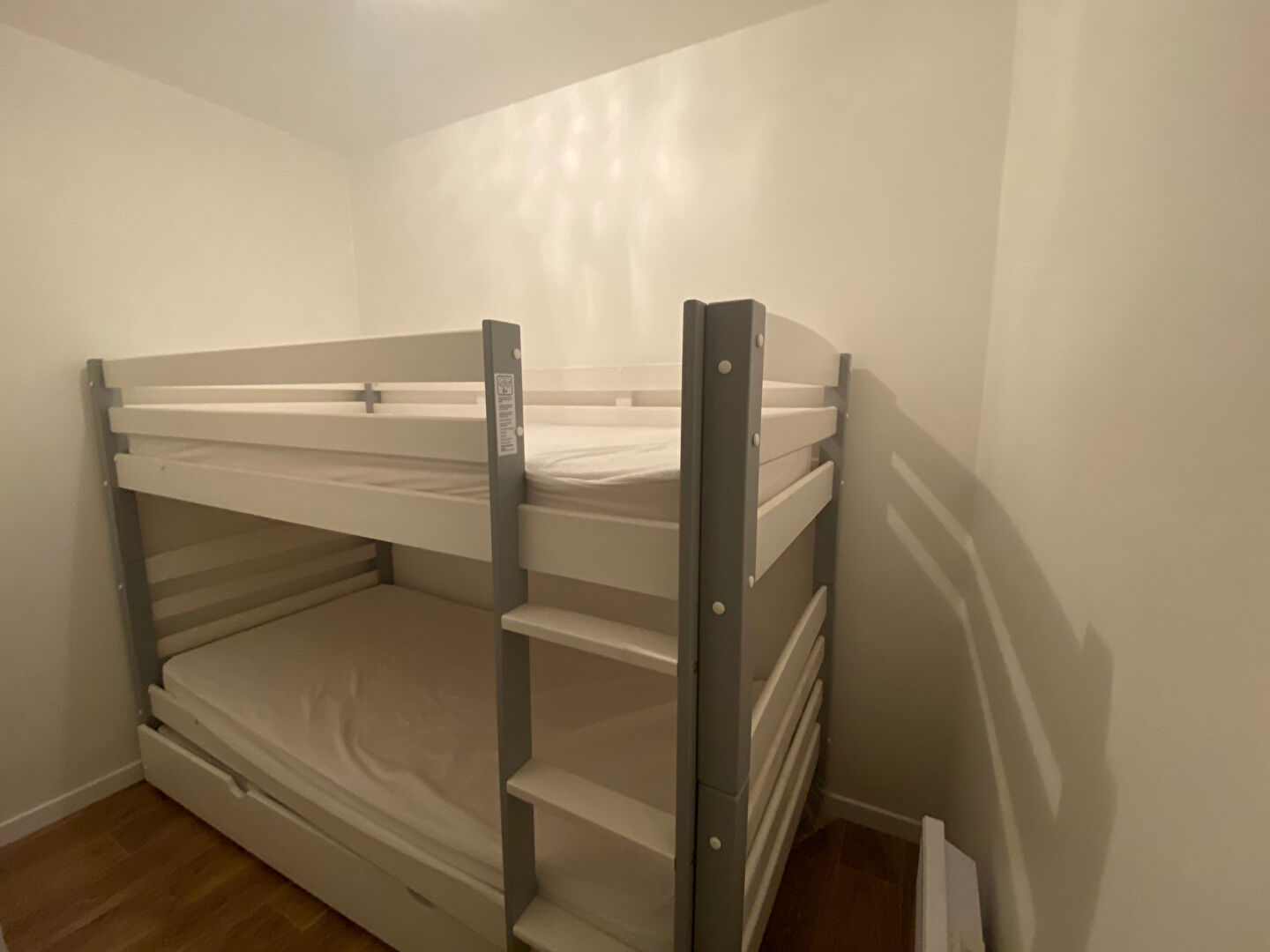 Un dégagement vers une cabine avec lits superposés, salle de bains et chambre avec placard.